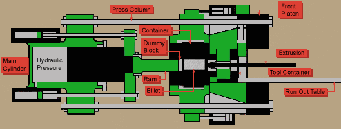 Ram- A steel rod attached to the main cylinder with a dummy block on the end that enters the container and applies pressure to the billet.